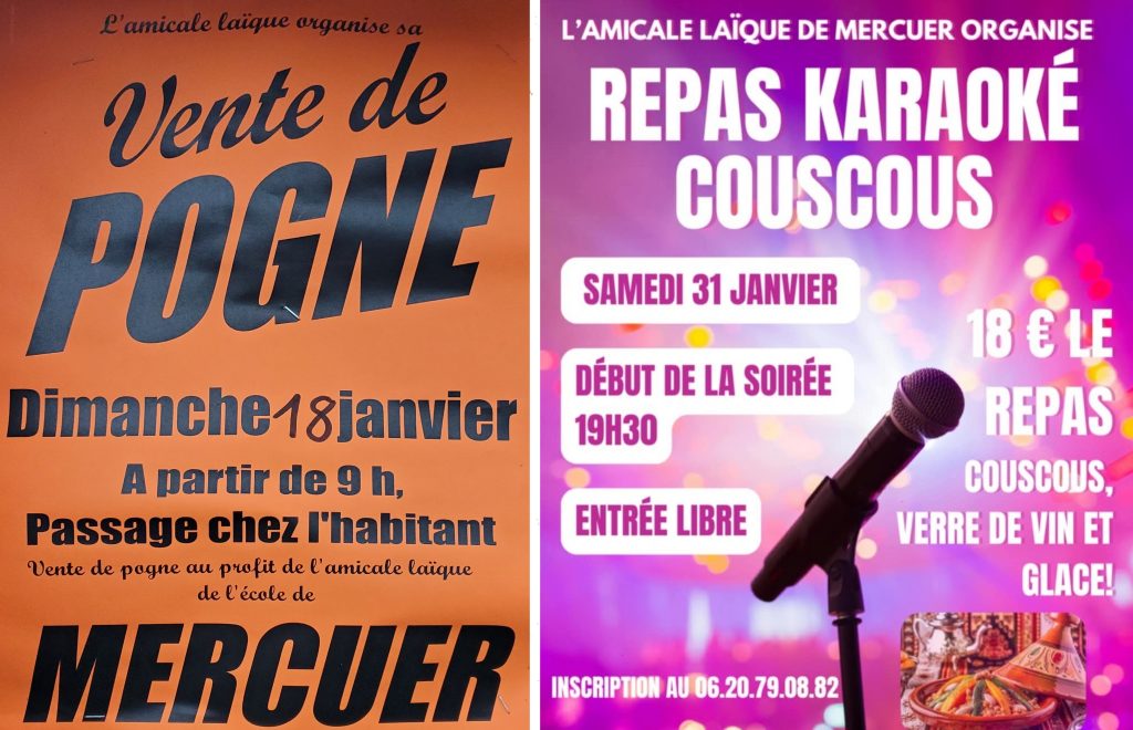 Amicale laïque de l’école de Mercuer – le 18 janvier 2026 vente de pognes et le 31 janvier 2026 Repas Karaoké Couscous (sur réservation au 06 20 79 08 82))
